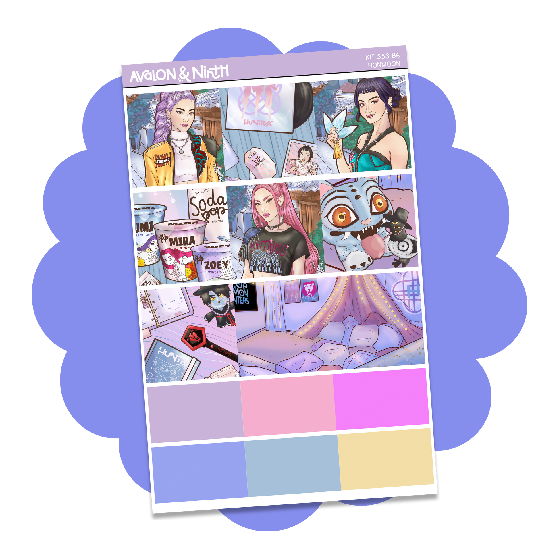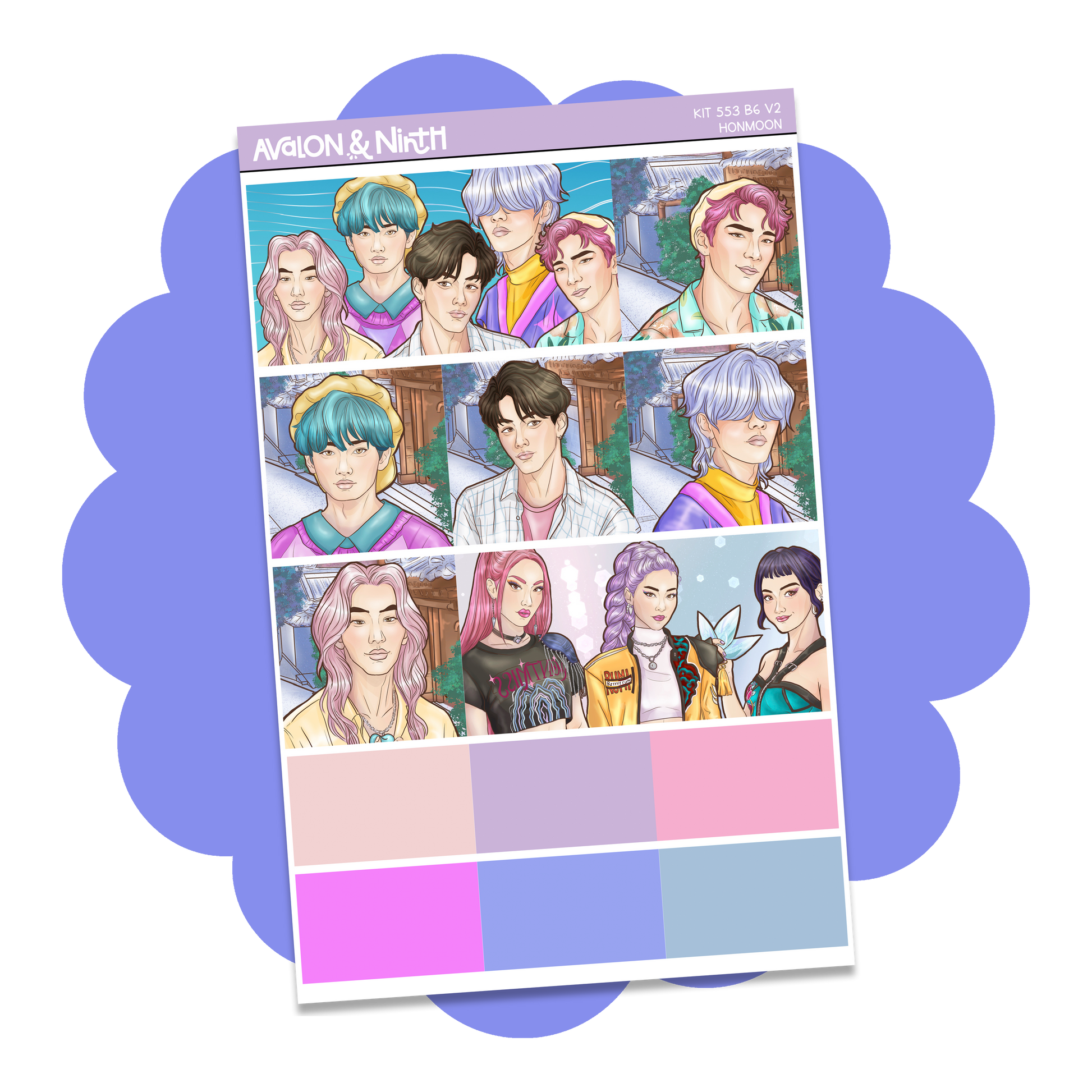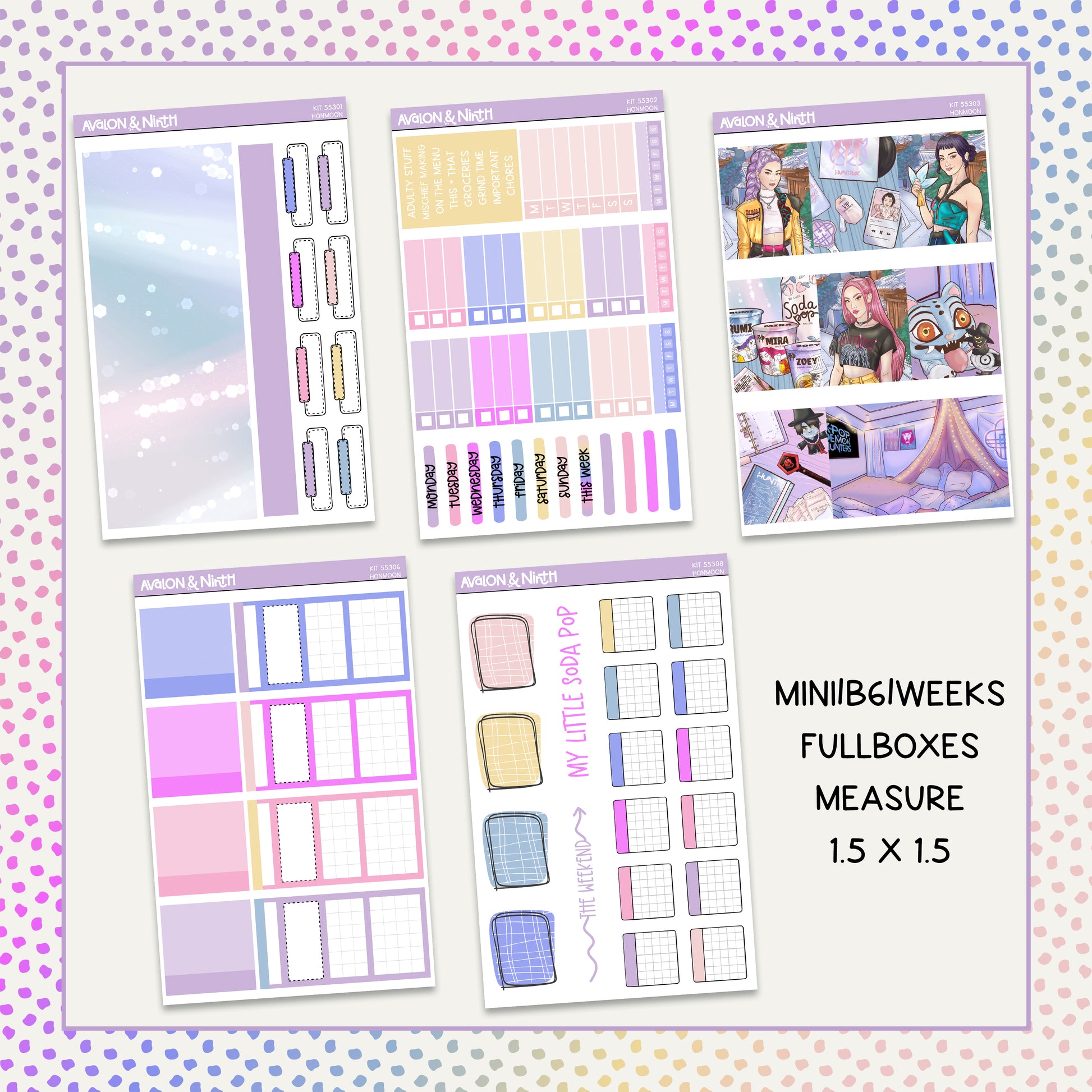 Honmoon is a 5-page mini kit that is designed for a number of planners. The fullboxes measure 1.5 x 1.5 and are perfect for academic planners, weeks planners, daily planners, standard vertical planners, B6 planners, and more. Buy the sheets you need or the full kit.