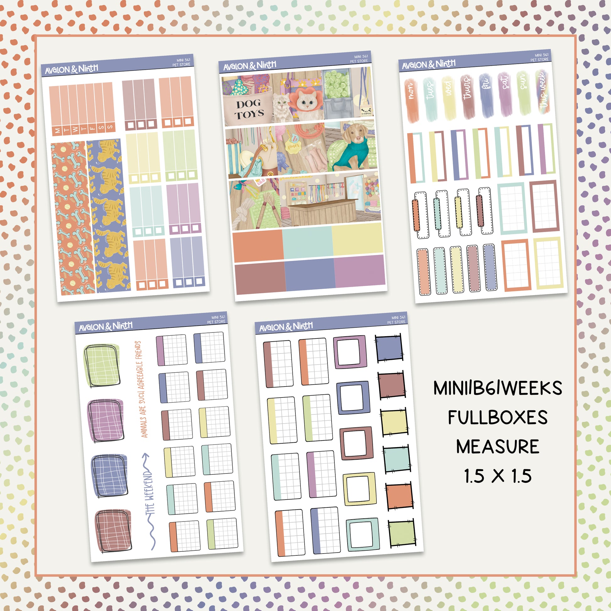 Pet Store is a 5-page exclusive art mini kit that is designed for a number of planners. The fullboxes measure 1.5 x 1.5 and are perfect for academic planners, weeks planners, daily planners, standard vertical planners, B6 planners, and more. Buy the sheets you need or the full kit.