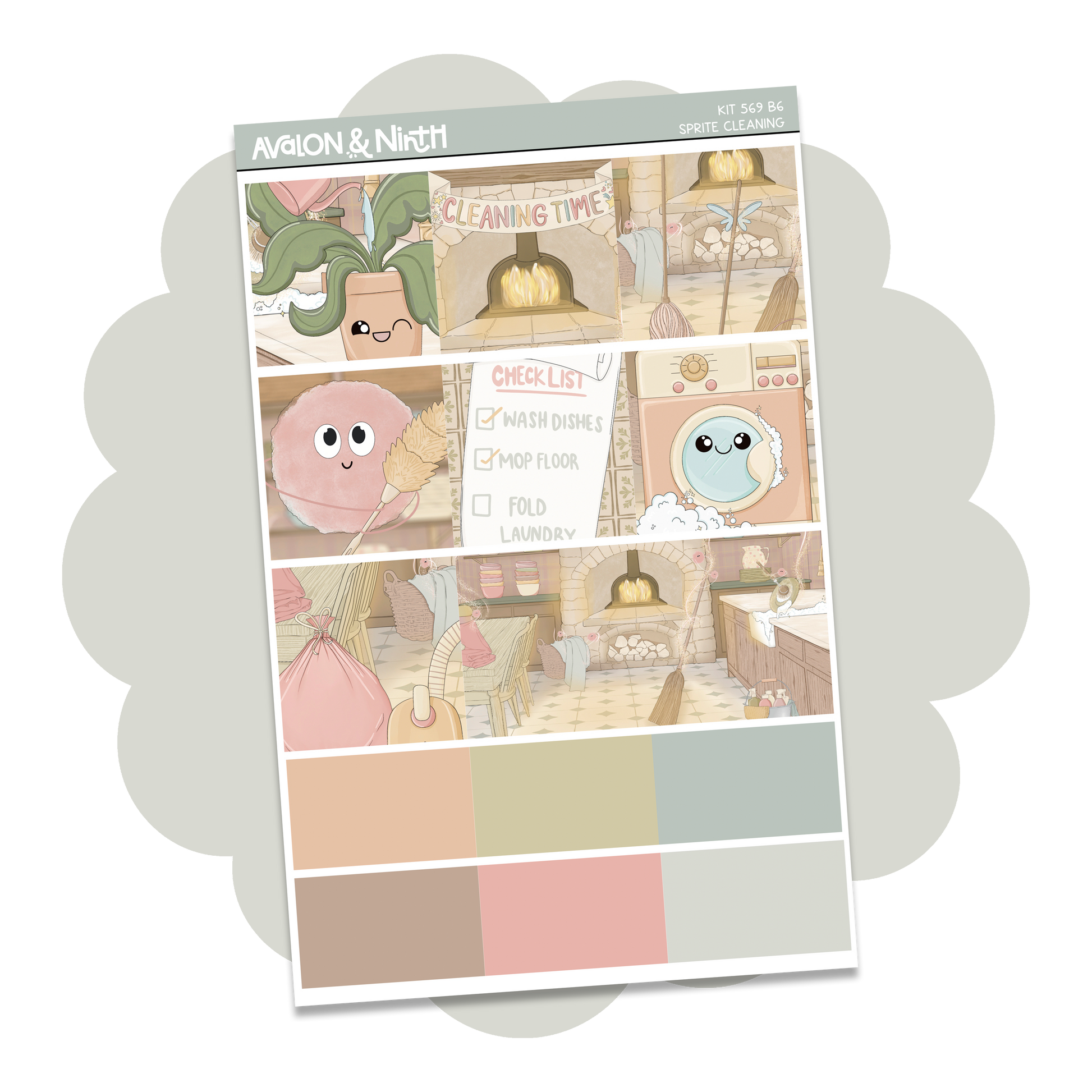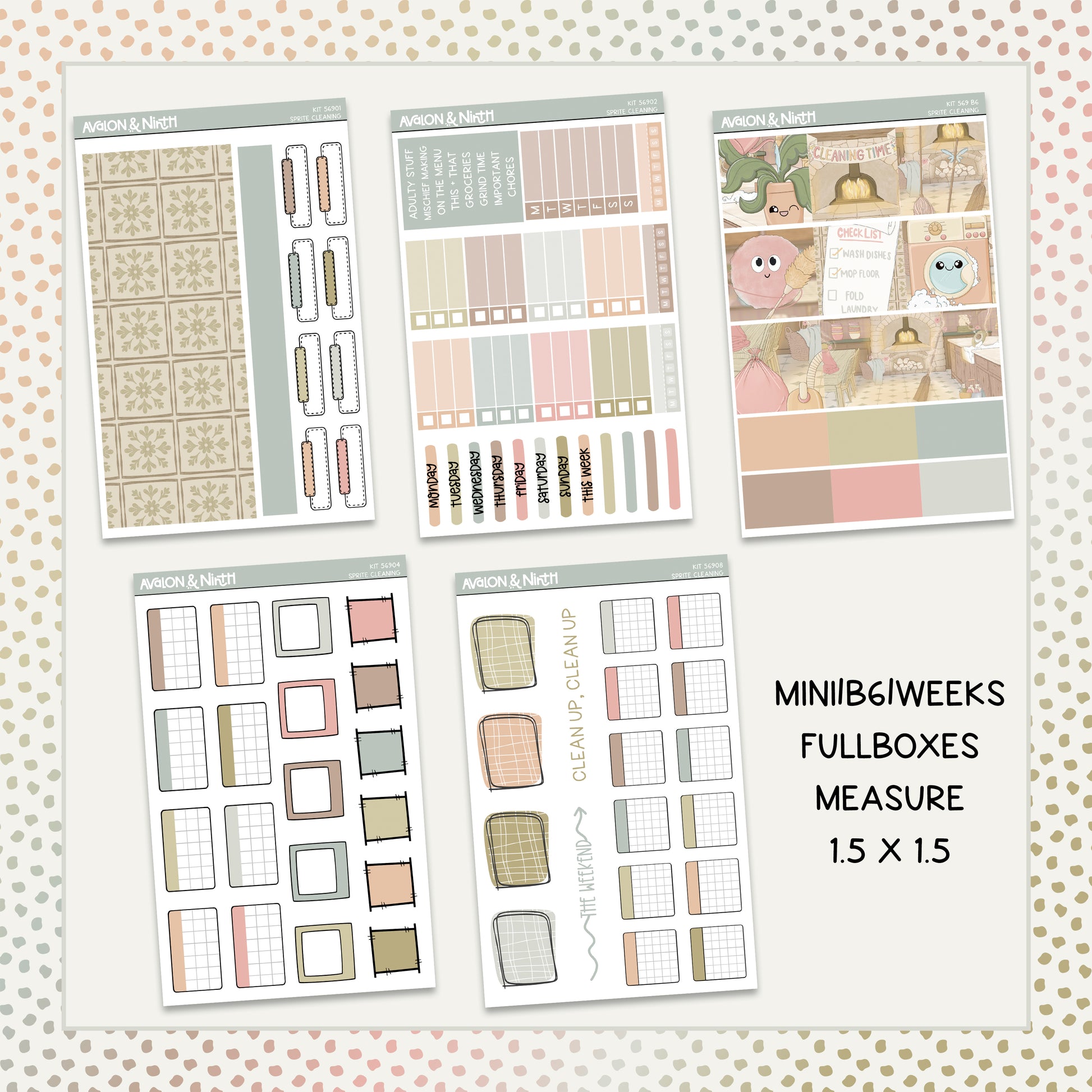 Sprite Cleaning is a 5-page exclusive art mini kit that is designed for a number of planners. The fullboxes measure 1.5 x 1.5 and are perfect for academic planners, weeks planners, daily planners, standard vertical planners, B6 planners, and more. Buy the sheets you need or the full kit.