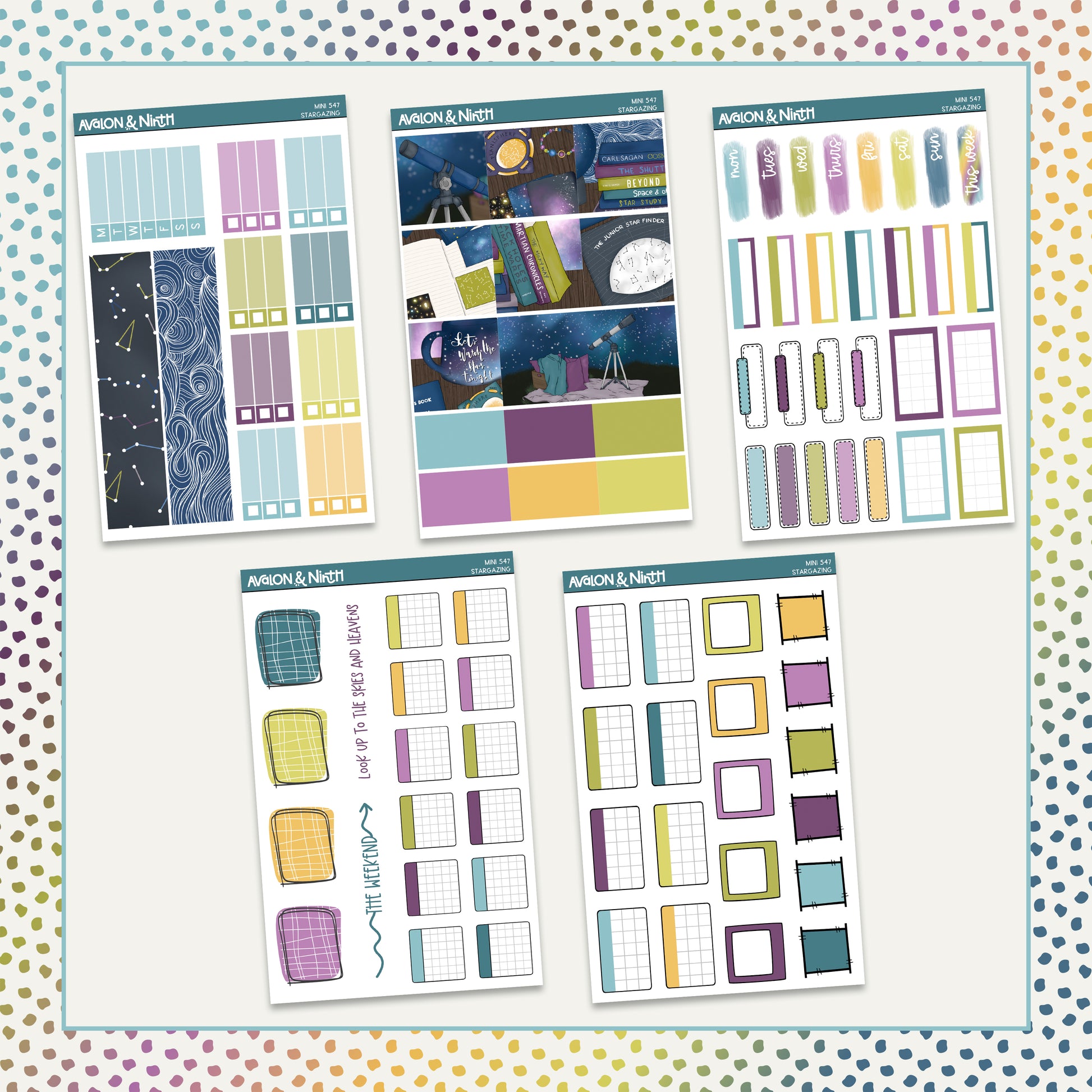 Stargazing is a 5-page mini kit that is designed for a number of planners. The fullboxes measure 1.5 x 1.5 and are perfect for academic planners, weeks planners, daily planners, standard vertical planners, B6 planners, and more. Buy the sheets you need or the full kit.