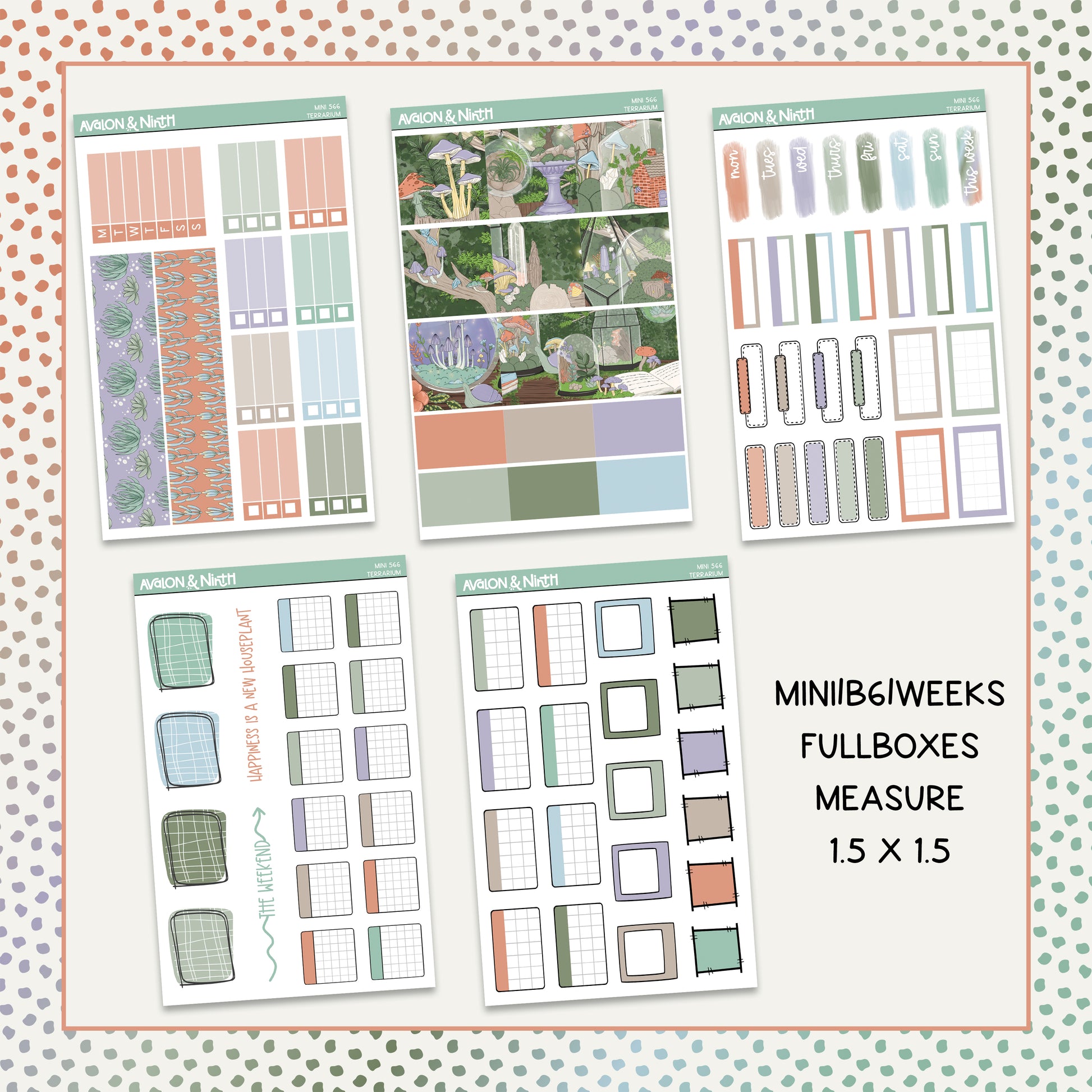 Terrarium is a 5-page exclusive art mini kit that is designed for a number of planners. The fullboxes measure 1.5 x 1.5 and are perfect for academic planners, weeks planners, daily planners, standard vertical planners, B6 planners, and more. Buy the sheets you need or the full kit.